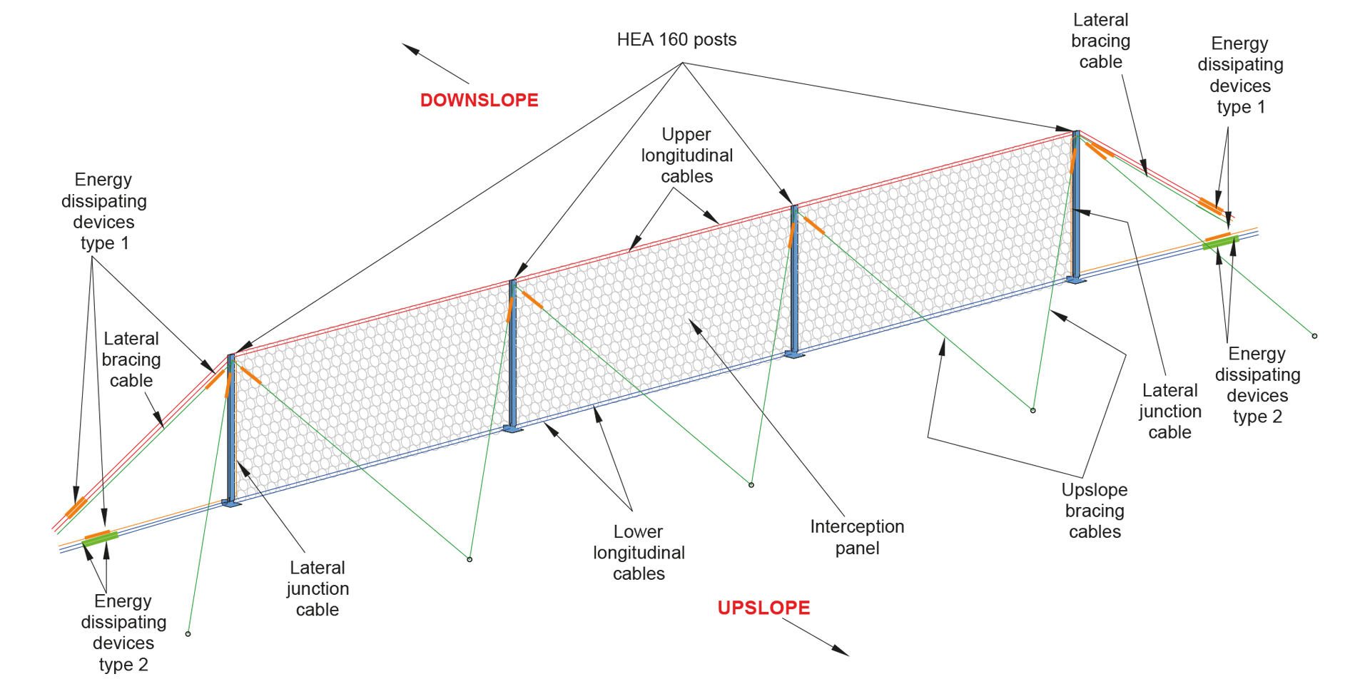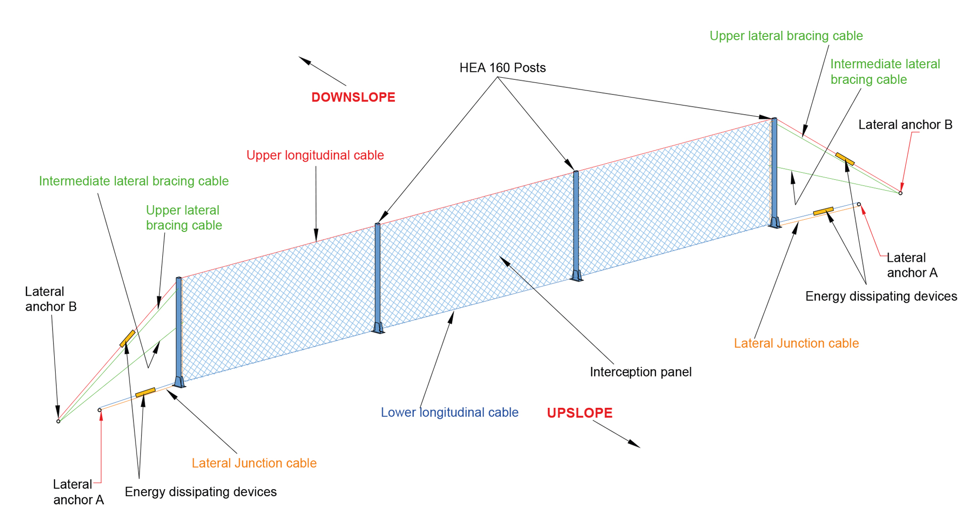 The main interception layer consists of a continuous net, placed along the whole length of the downslope side of the barrier, thus forces are distributed along the barrier, reducing the stresses on the foundations.