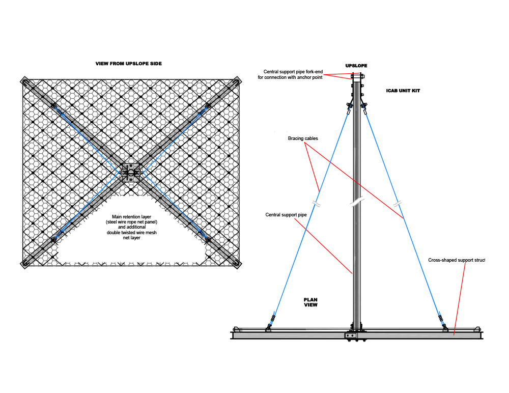 Le barriere ICAB, progettate e sperimentate primariamente per il contenimento di masse nevose instabili, sono strutture modulari del tipo mono-ancoraggio costituite da un telaio di supporto in acciaio formato da un elemento tubolare centrale per la connessione all’ancoraggio di fondazione e da due travi in acciaio disposte a croce, alle cui estremità è vincolato un pannello di rete in acciaio.