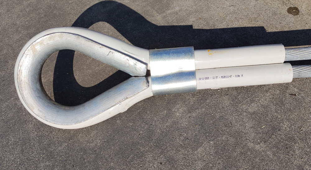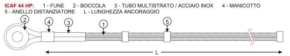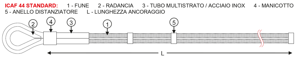 Gli ancoraggi ICAF 44 in versione “standard” sono realizzati in fune spiroidale, ripiegata su se stessa a formare un cavallotto fissato su una radancia zincata a caldo: la fune, in corrispondenza della testa dell’ancoraggio e della radancia, è inserita in un tubo multistrato o in acciaio inox, che ha la funzione di proteggere ulteriormente la parte di ancoraggio esposta all’ambiente rispetto alla corrosione e/o abrasione della fune.
